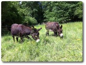 Der Innenhof ist zur Straße hin abgegrenzt und als großzügige Spielfläche nutzbar. Unterhalb des Wohnhauses verfügen wir über einen Hausgarten mit Gemüsebeeten und einer Grillstelle. Hinter und neben dem Scheunenbereich stehen den beiden Eseln Weideflächen zur Verfügung, die von einem Bach und einem Zaun eingefasst sind.